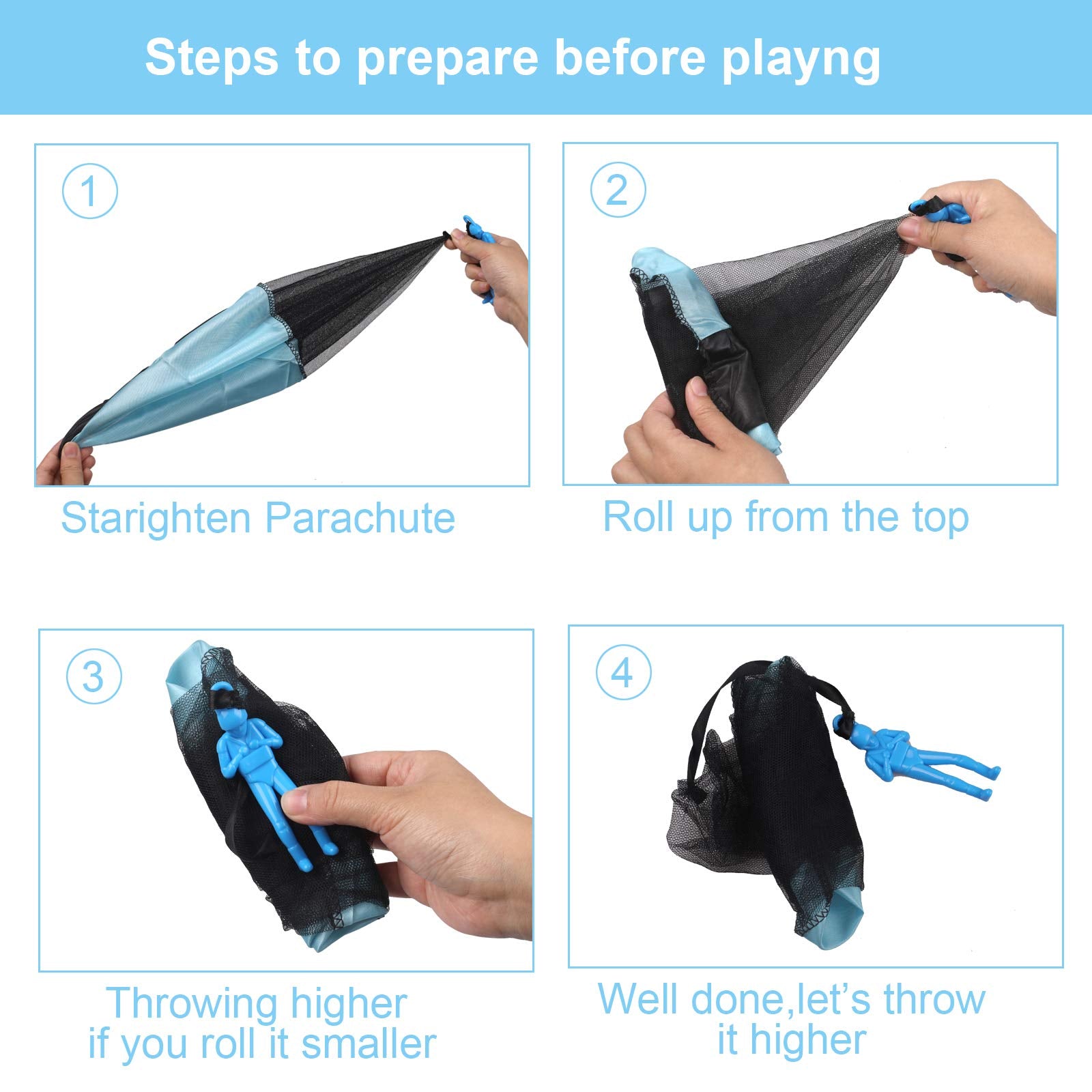 - 【Flugspaß Spielzeug】 Die Fallschirme öffnen sich einwandfrei ohne dass sich irgendetwas verheddert. Bei Wind fliegen die kleinen Fallschirmspringer, mit der richtiger Wurftechnik super. Hinweis:Man kann sie im Wind wehen lassen oder vom Balkon werfen.